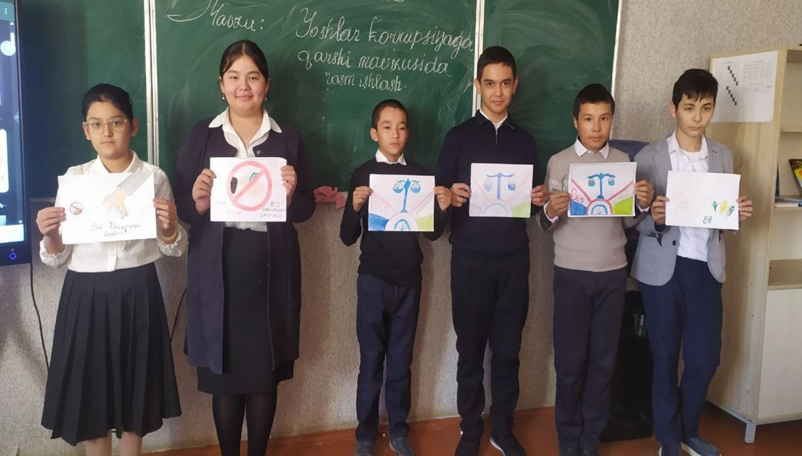 Korrupsiyaga qarshi kurashda har bir fuqaroning, ayniqsa yosh avlodning mas’uliyati. O‘quvchilarning ko‘plab ishlarida korrupsiyaga qarshi kurashning ramziy ifodalari, halollikka chaqiruvchi obrazlar, qonun ustuvorligini targ‘ib qiluvchi g‘oyalar yorqin ranglar, zamonaviy grafik uslublar va estetik yondashuvlar orqali tasvirlangan.